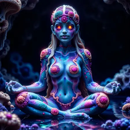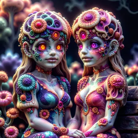 Trained on one image, training tags were: colored skin, colored sclera, looking at another, 2girls, glowing eyes, profile, portrait, breasts