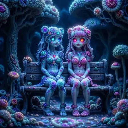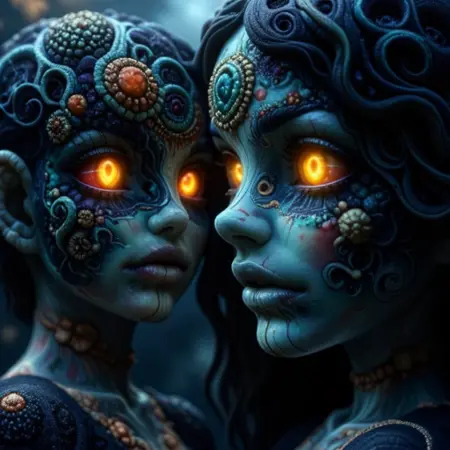 한 장의 이미지를 사용해 학습됨. 학습 태그: 컬러된 피부, 컬러된 공막, 다른 사람을 바라보는, 2명의 소녀, 빛나는 눈, 프로필, 초상화, 가슴