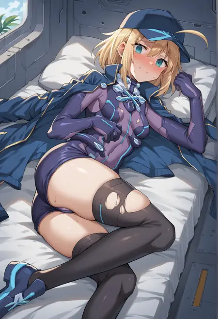第三形態: 小さな胸、ポニーテール、金髪、サイドロール、中程度の髪長、青い目、アホ毛、ベースボールキャップ、ボディスーツ、長袖、ショートパンツ、シンクレア、肩にコートを羽織り、ジッパーを開けた状態