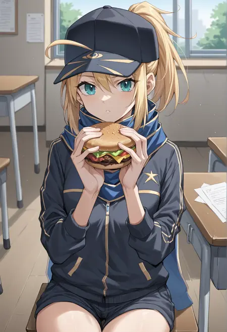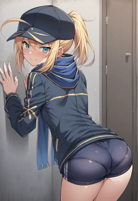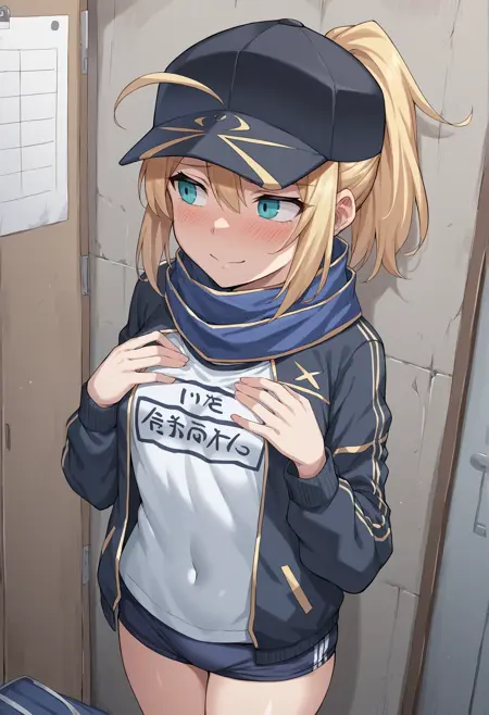 第二形態: 小さな胸、ポニーテール、金髪、サイドロール、中程度の髪長、青い目、アホ毛、ブラックベースボールキャップ、ジャケット、スカーフ、ブルマ、服が開いた状態、ジャケット、名札