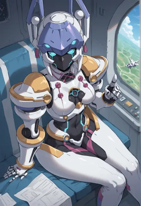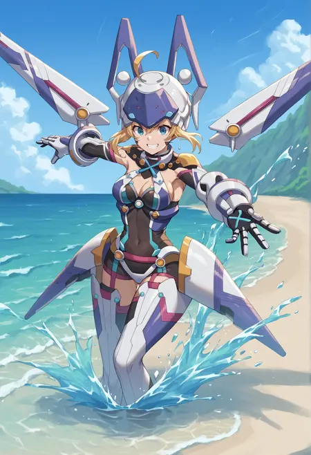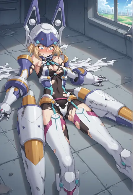 XX 第一階層進化: 中程度の胸、年齢進行、金髪、サイドロール、中程度の髪長、青い目、アホ毛、パワーアーマー、メカ娘、メカニカルアーム、メカニカルレッグ、ヘルメット