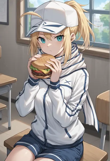 ウルトラヒロインZ: 小さな胸、ポニーテール、金髪、サイドロール、中程度の髪長、青い目、アホ毛、ホワイトベースボールキャップ、ホワイトジャケット、ホワイトスカーフ、ショートパンツ