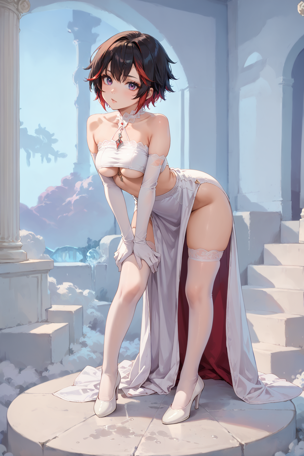 kk_sexydress_set35,1girl,breasts,solo,multicolored hair,elbow gloves,thighhighs,short hair,black hair,medium breasts,underboob,red hair, white footwear, high heels,