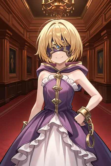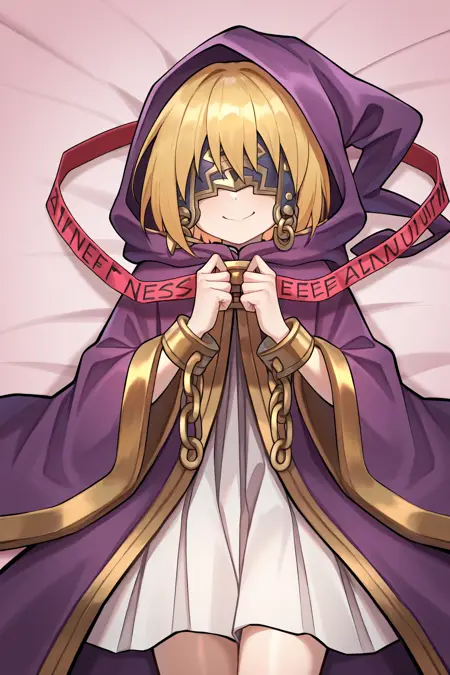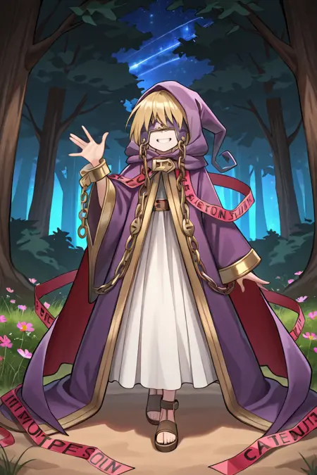 Helpful Tags: 1boy, blonde hair, mask, covered eyes, robe, purple robe, hood up, white skirt, caution tape, red caution tape, chains, cuffs, sandals,