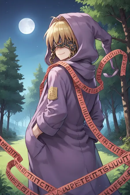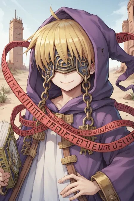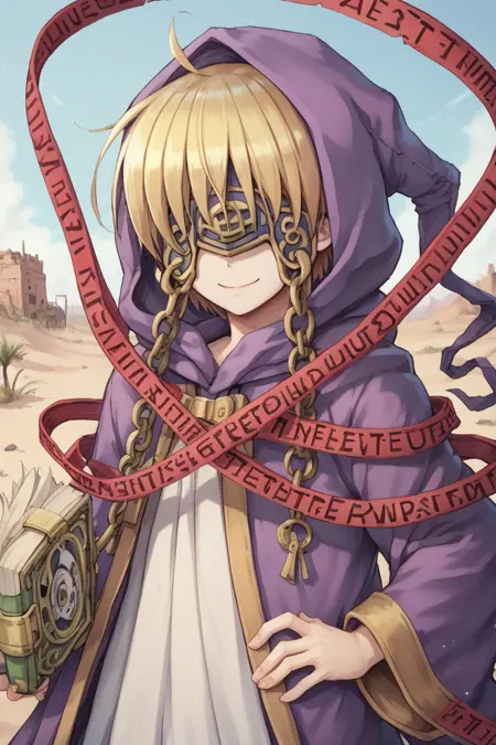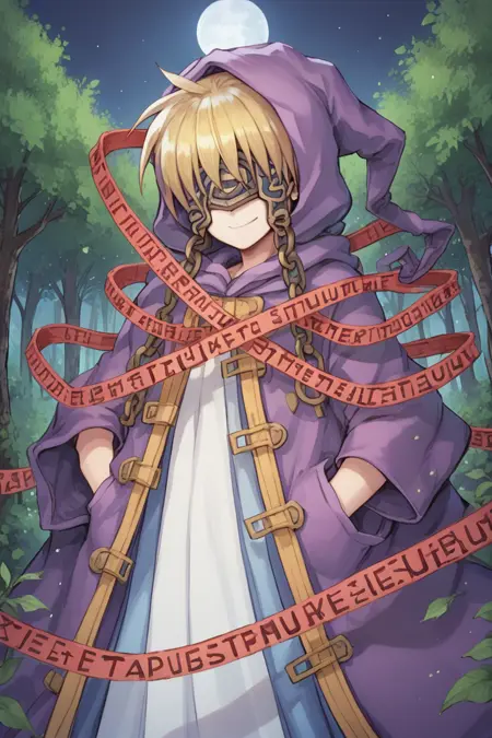 有用标签: 1boy,金发,面具,遮住眼睛,长袍,紫色长袍,兜帽向上,白色裙子,警示带,红色警示带,链条,袖口,凉鞋,