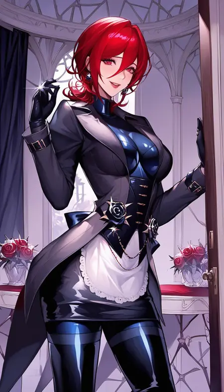MacchiatoPTN, 붉은 눈, 붉은 머리, 짧은 머리, 검은 재킷, 진한 네이비 라텍스 상의, 높은 칼라, 치마, 진한 네이비 스타킹, 허벅지 스타킹, 라텍스 스타킹, 검은 장갑, 장미 장식, 반지, 귀걸이, 하이힐