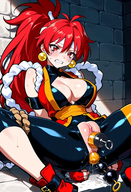 red eyes, high ponytail, long hair, red lips,