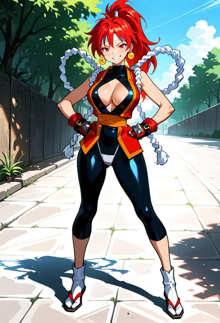 white headband, earrings, bodysuit, cleavage cutout, shimenawa, fingerless gloves, red gloves, sash, spandex, tabi, red fotwear,