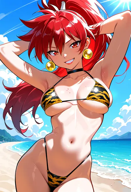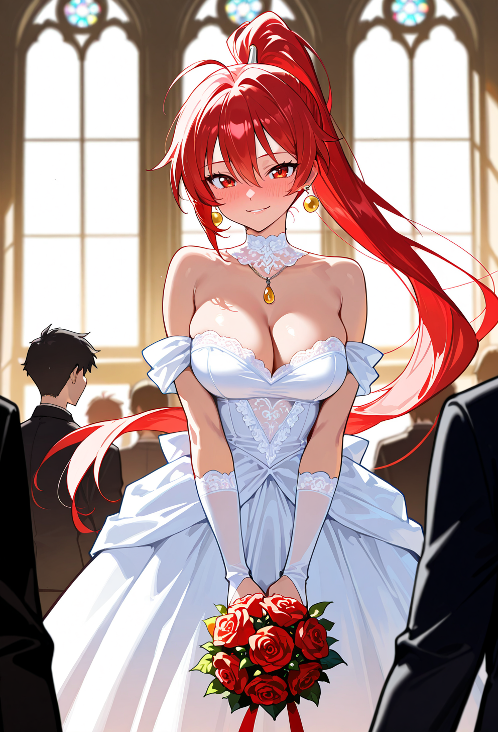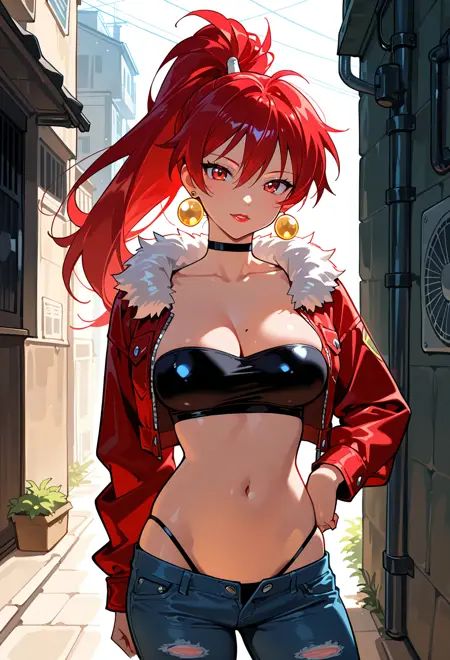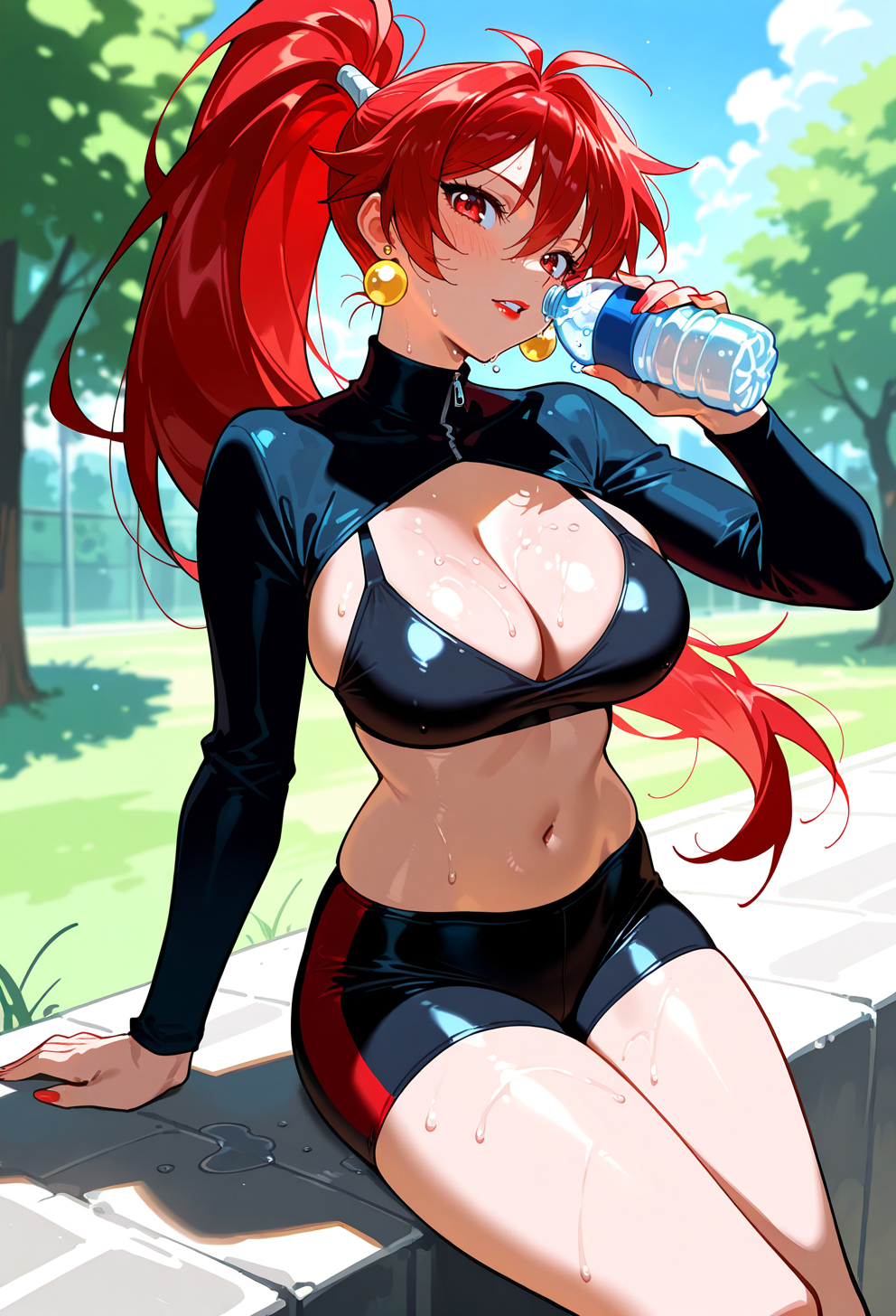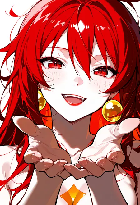 high ponytail, red hair, red eyes, red lips,