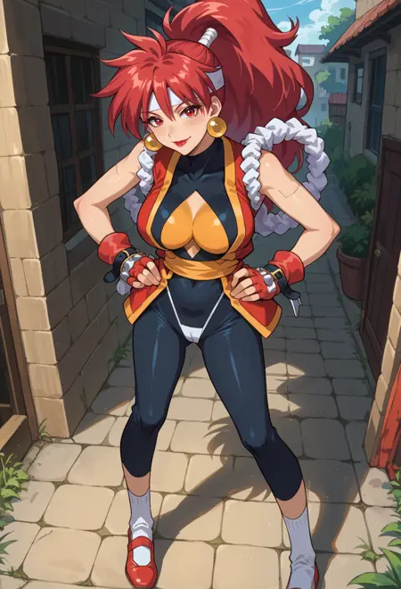 white headband, earrings, bodysuit, cleavage cutout, shimenawa, fingerless gloves, red gloves, sash, spandex, tabi, red fotwear,