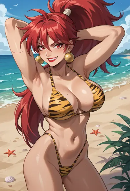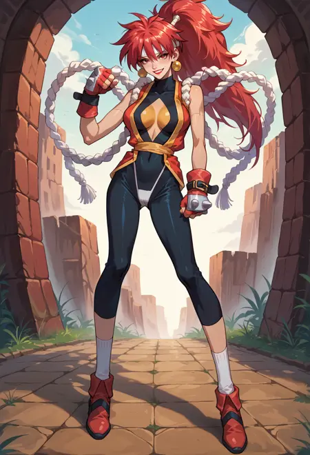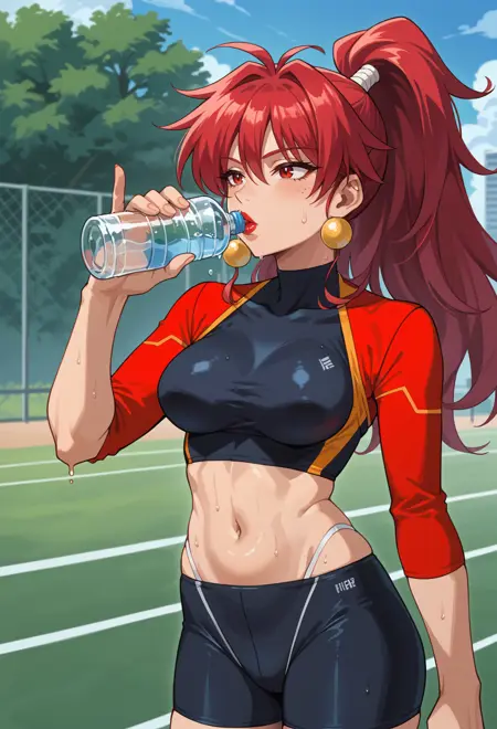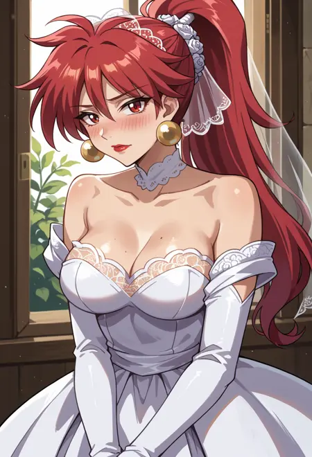 high ponytail, red hair, red eyes, red lips,