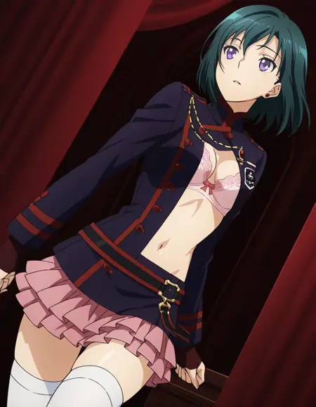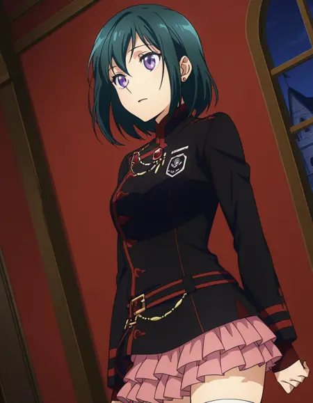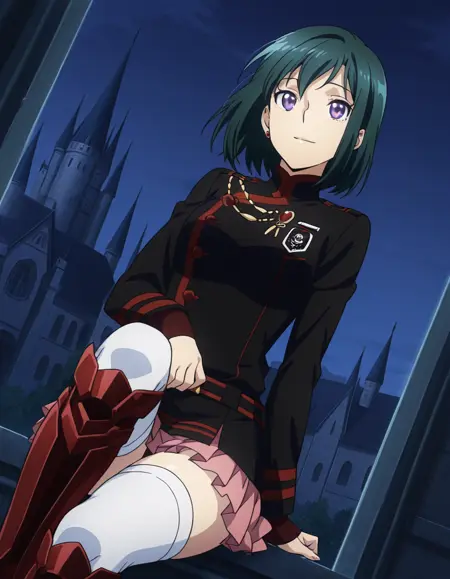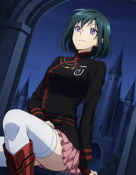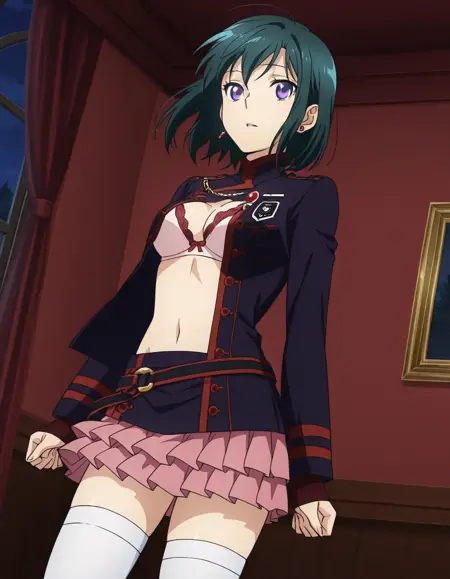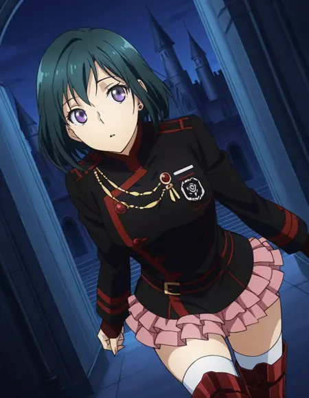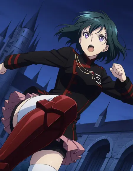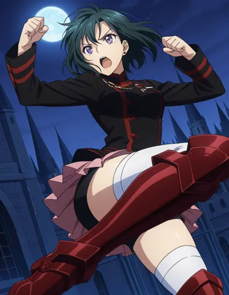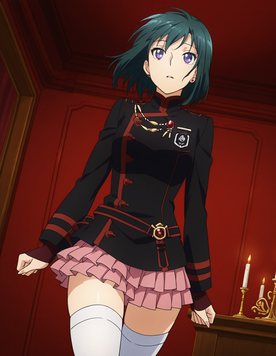 third uniform, , black collared jacket with red details, long sleeves, red arm sleeves , emblem, pleated skirt, Pink miniskirt, zettai ryouiki, White thighhighs , red metal boots, earring