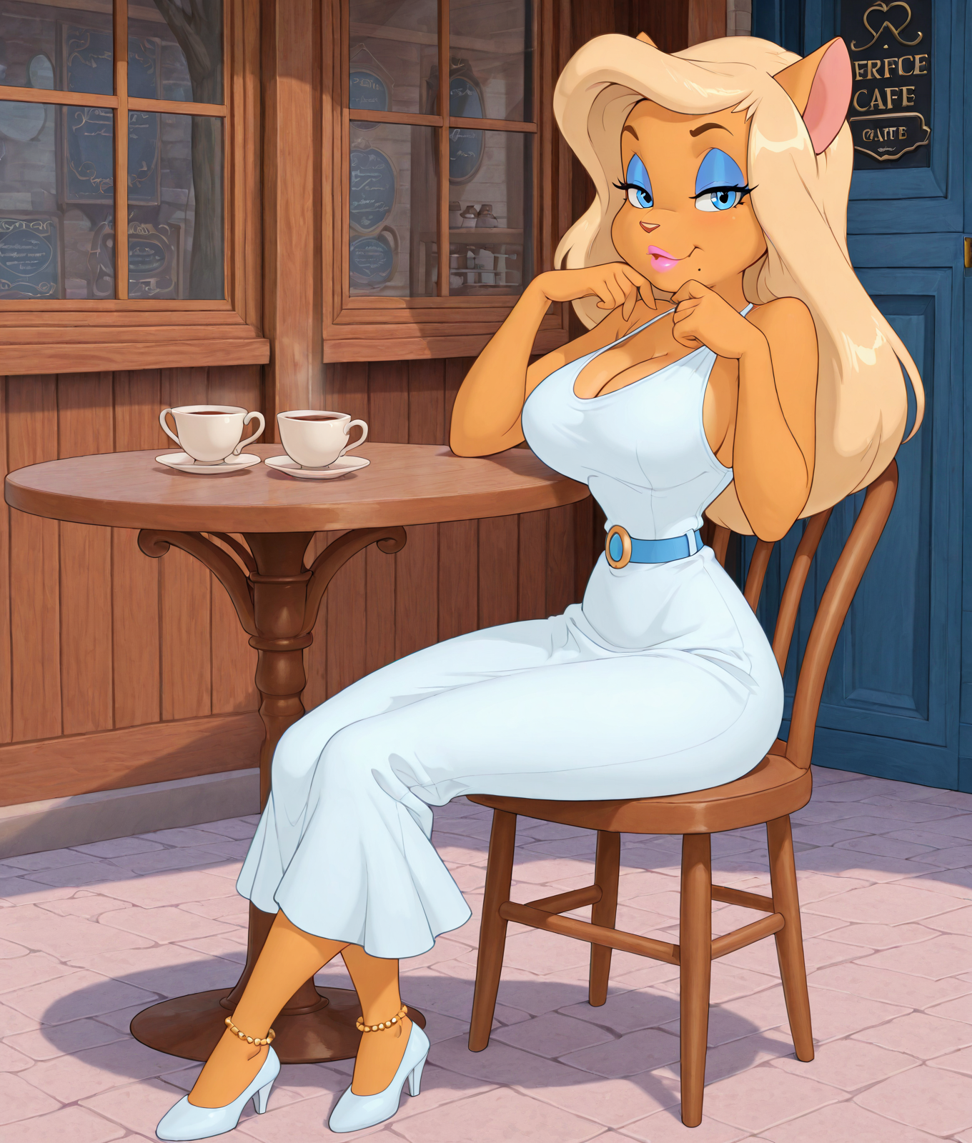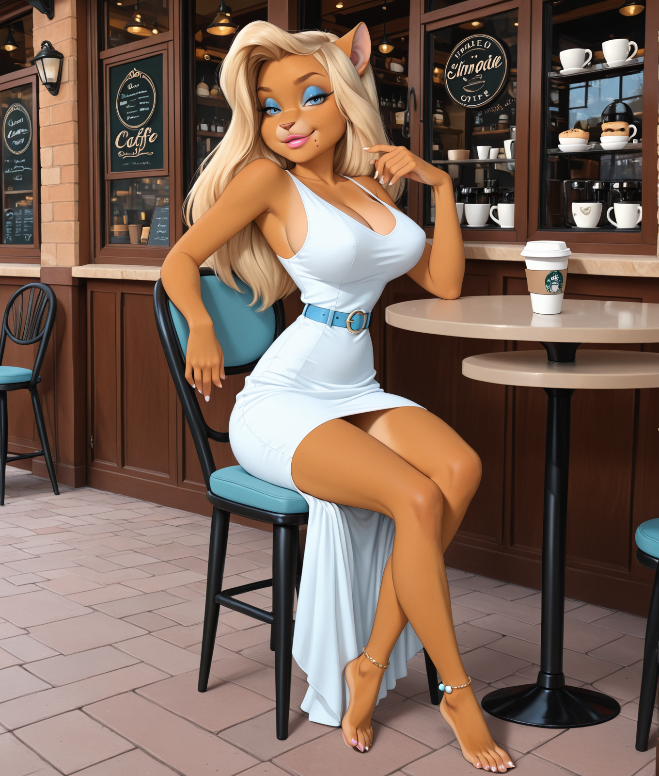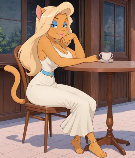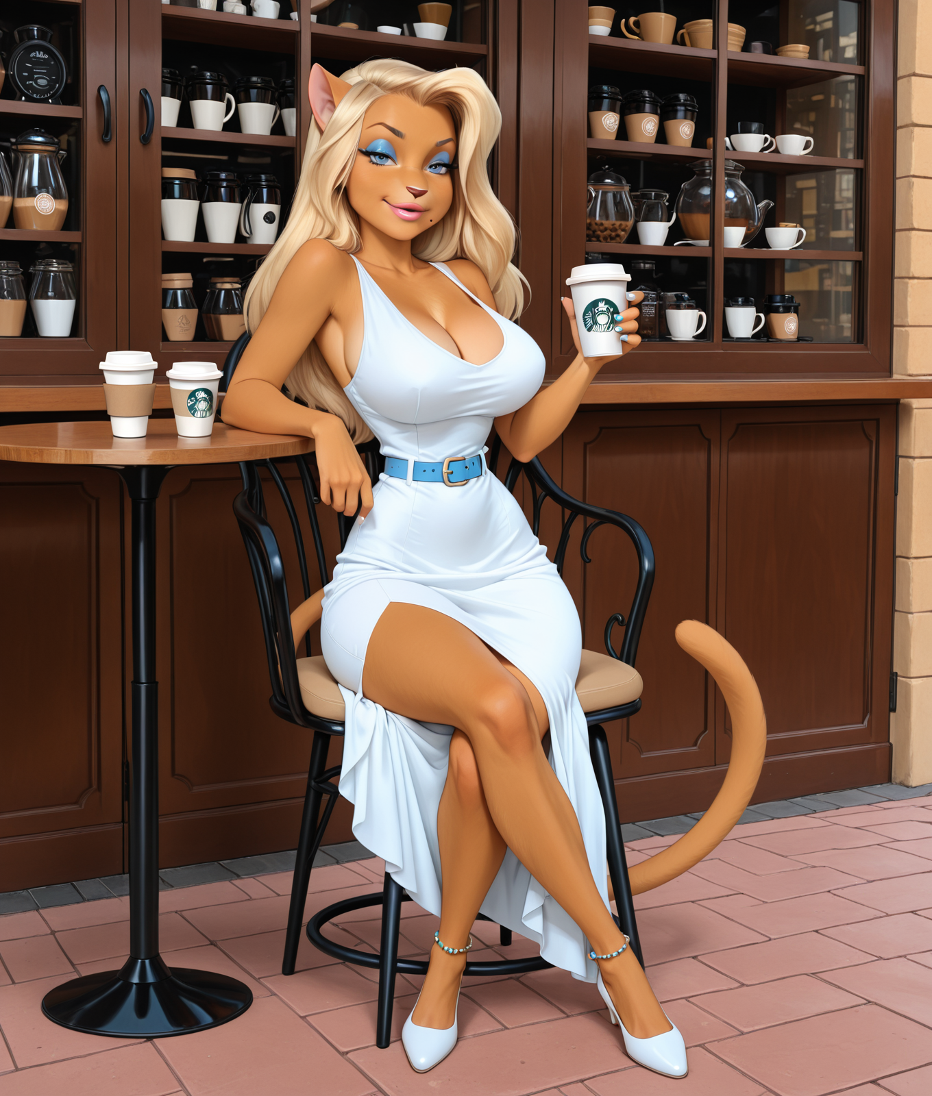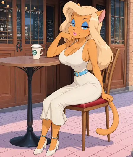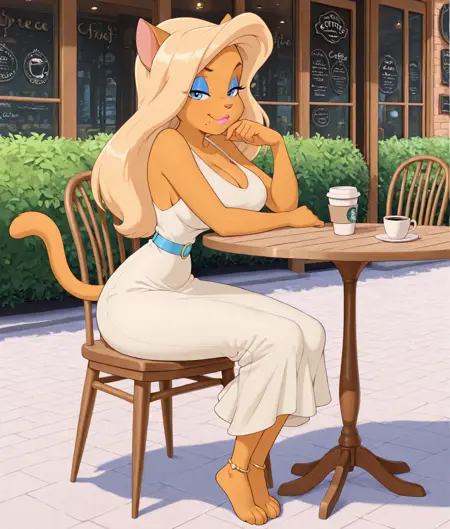 kitten kaboodle, furry, cat ears, cat tail, huge breasts, blonde hair, toon (style), flat color, beige fur, blue eyeshadow, pink lips, original, blue eyes, mole on cheek, narrow waist,