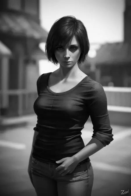 Zoe7,Black short hair, white vest, black jeans, black shoes,