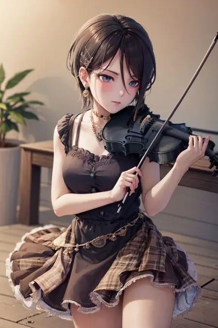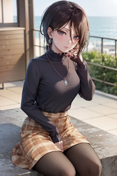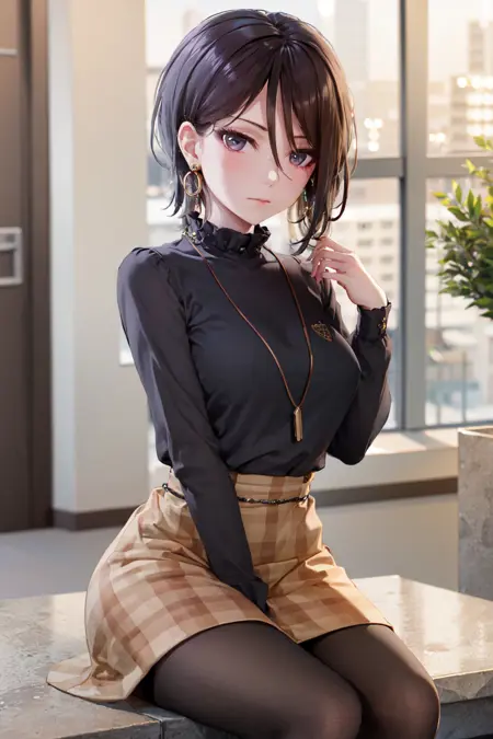 默认服装: 黑色毛衣,格纹裙,首饰,耳环,项链