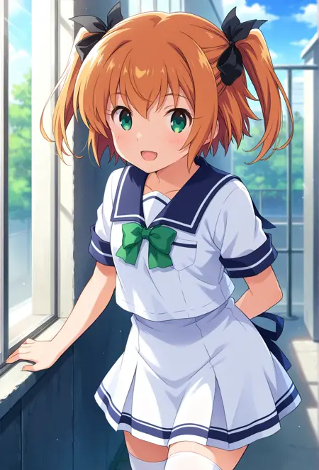 white_ school_uniform, white_thighhighs, white_ serafuku, green_bow,