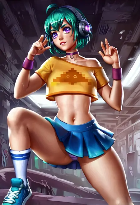 Aim-e, 1girl, solo, short hair, ahoge, skirt, shirt, navel, purple eyes, panties, green hair shoes, choker, socks, midriff, mini_skirt, crop top, aqua hair, headphones, wristband, sneakers, nutaku