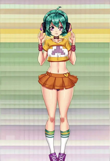 Aim-e, 1girl, solo, short hair, ahoge, skirt, shirt, navel, purple eyes, panties, green hair shoes, choker, socks, midriff, mini_skirt, crop top, aqua hair, headphones, wristband, sneakers, nutaku