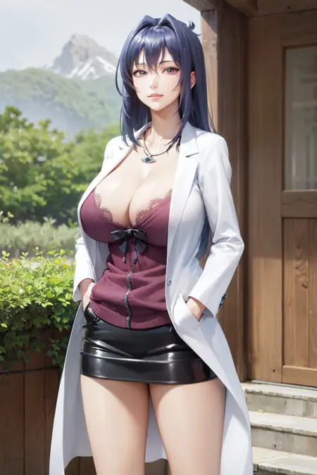 默认服装: 实验服, 开敞外套, 衬衫, 短裙, 项链, 乳沟