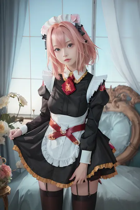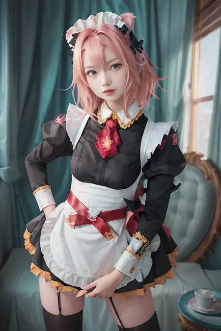 ブラックメイドドレスにホワイトエプロン、グリフィン模様のレッドネクタイ、ピンクの編みこみ髪、ヘアボウリボン、ブラックハイソックス、レッドウエストリボン