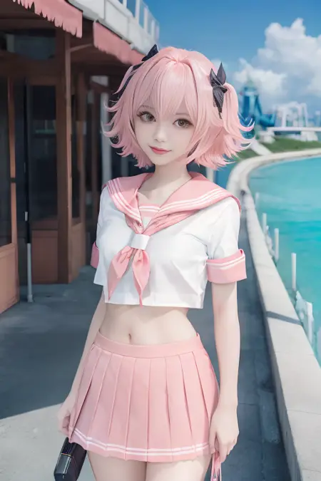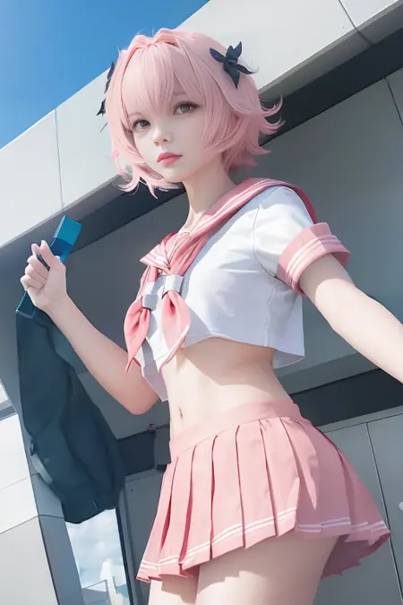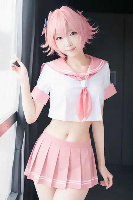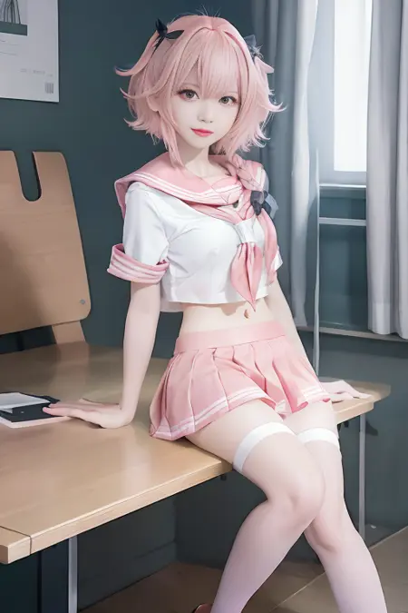 白色衬衫,粉色领子,粉色裙子,白色过膝袜,黑色鞋子,黑色发带