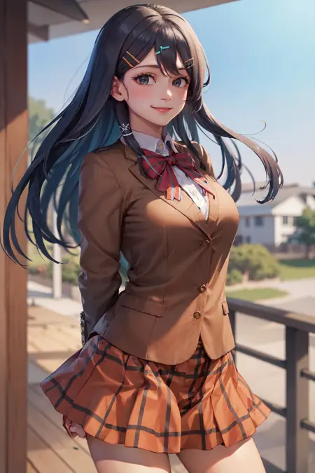 Default Outfit: hairclip, hair ornament, school uniform, red bow, plaid skirt
