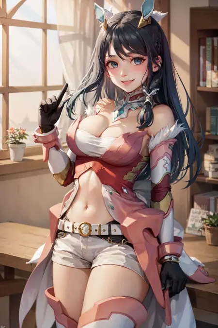 Carnage Form: blue hair, carnageform, detached sleeves, black shorts, thigh boots, gloves, cleavage