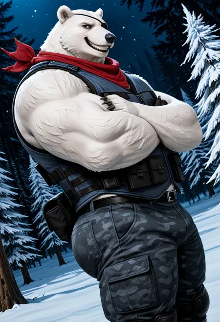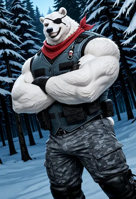 eyepatch, helmet, red scarf ,vest dark blue pants