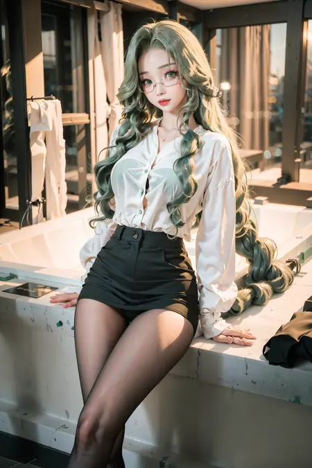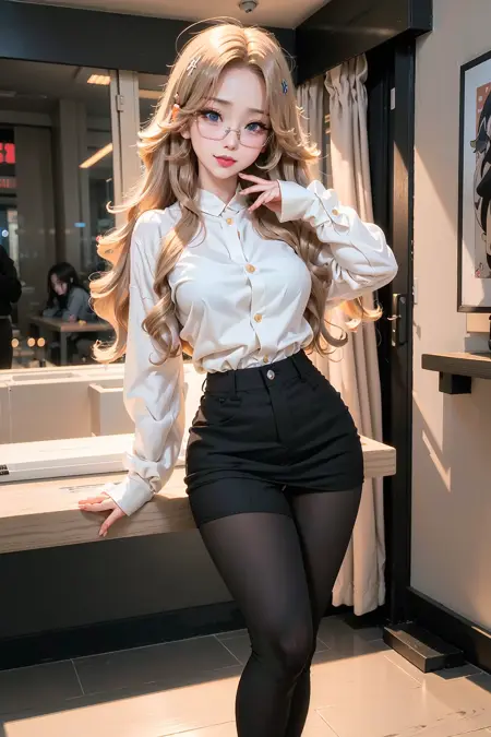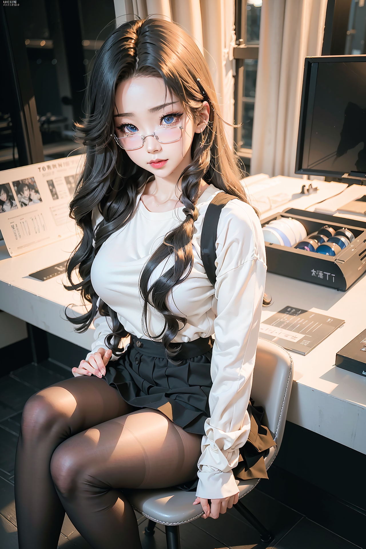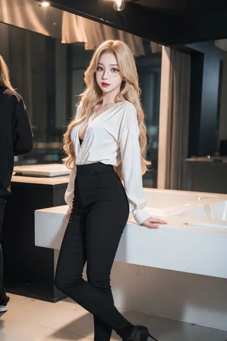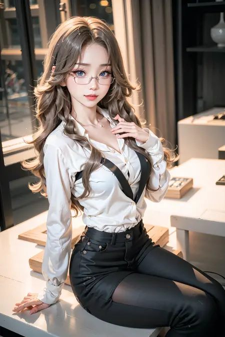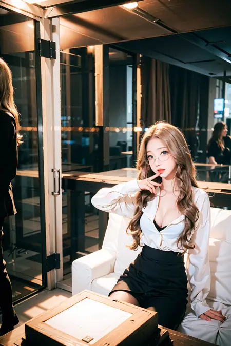 这是一种受性感办公室女性启发的造型,场景设定在办公室或酒店房间。