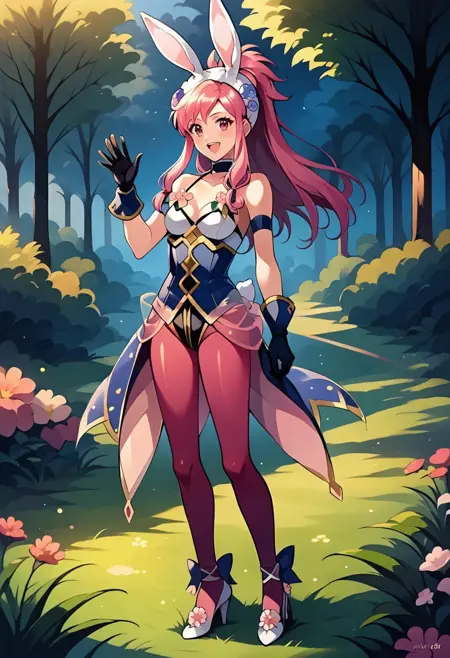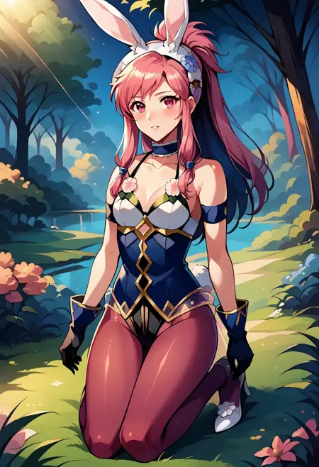 Spring Outfit: SFit, fake animal ears, rabbit ears, hair ornament, hair flower, blue detatched collar, multicolored leotard, white leotard, blue leotard, black leotard, bare shoulders, blue armlet, pink pantyhose, see-through, multicolored gloves, blue gloves, black gloves, white high heels, fake tail, rabbit tail,