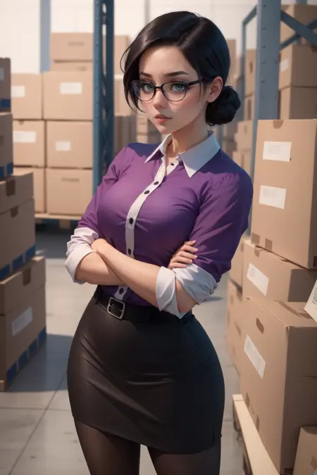 Add "glasses, purple shirt, pencil skirt, pantyhose, high heels" for her typical look. "Green eyes" also helps for consistency.