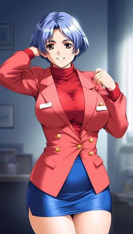 ShiraishiMomoko, blue hair, short hair, large breasts, brown eyes,
