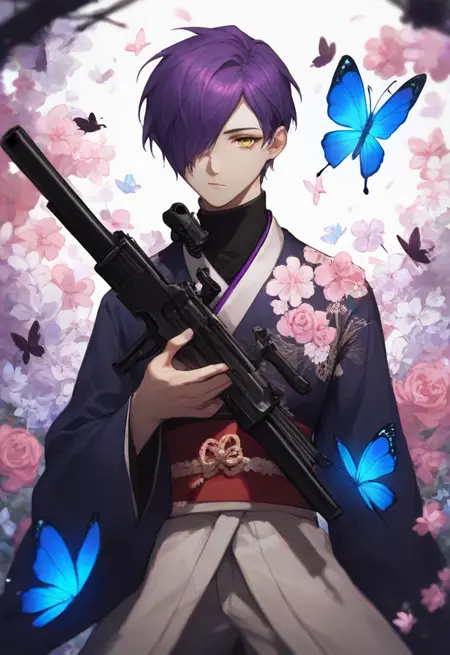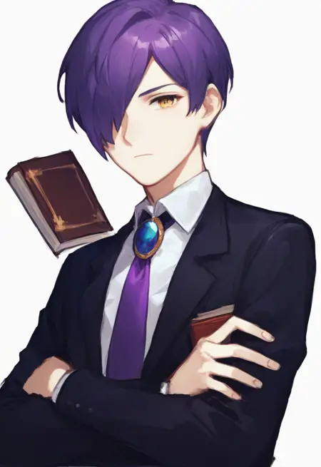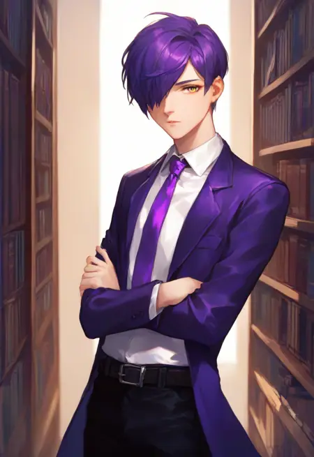 YesodLOR, hair over eye, white shirt, purple necktie, jewelry, purple coat, open coat, belt, purple pants, black footwear