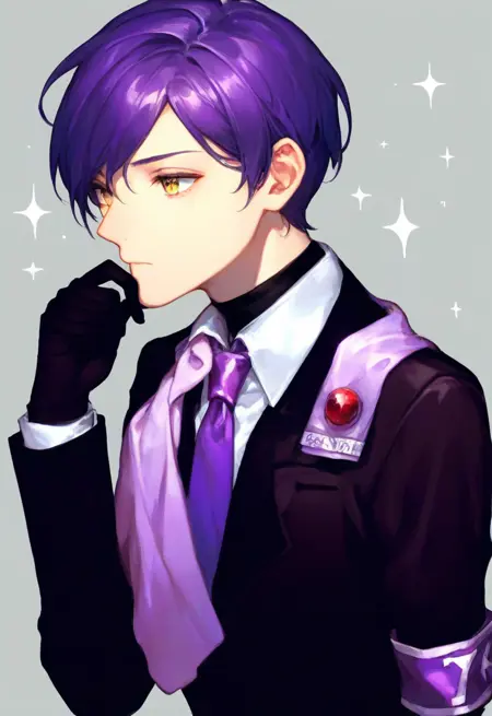 YesodLC, armband, black turtleneck, white shirt, purple necktie, black jacket, black gloves, black pants, brown footwear