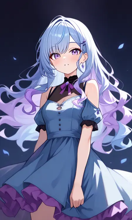 score_9, score_8_up, score_7_up, score_6_up, score_5_up, score_4_up, source_anime, solo, flat color, dark theme, 1girl, babblty, purple eye, long blue hair, wavy hair, blue to purple gradient, blue dress, dynamic pose, looking at viewer,