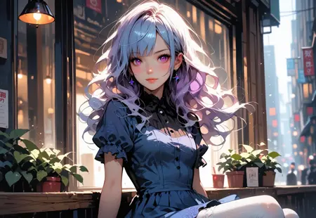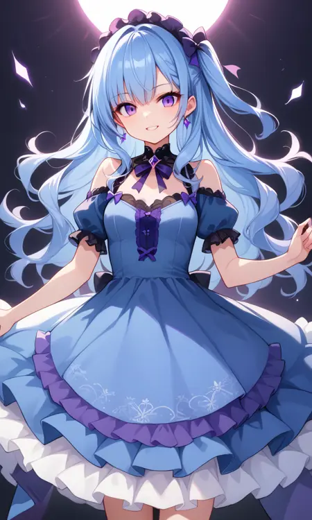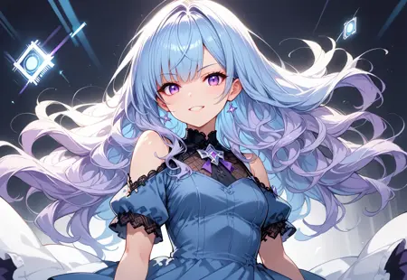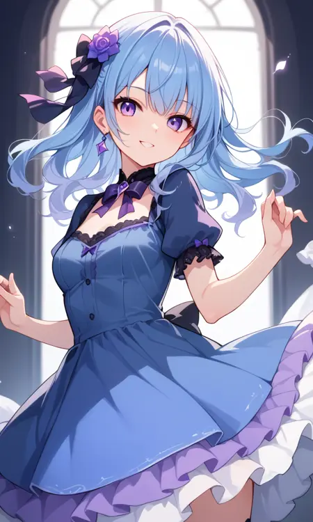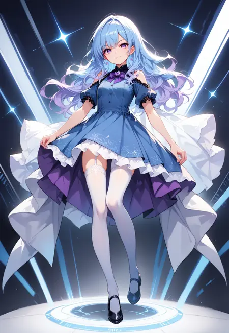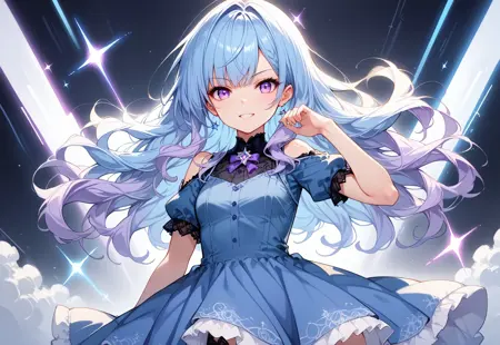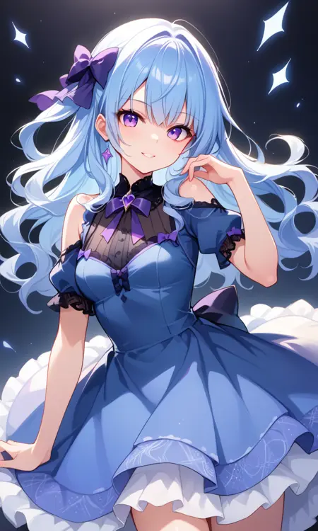 score_9, score_8_up, score_7_up, score_6_up, score_5_up, score_4_up, source_anime, solo, flat color, dark theme, 1girl, babblty, purple eye, long blue hair, wavy hair, blue to purple gradient, blue dress, dynamic pose, looking at viewer,
