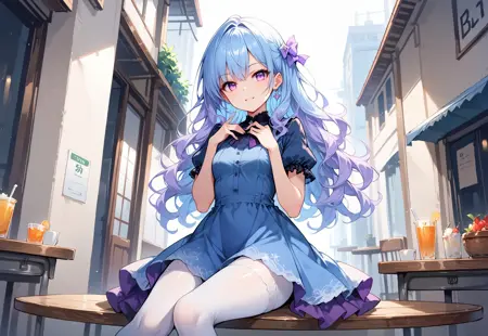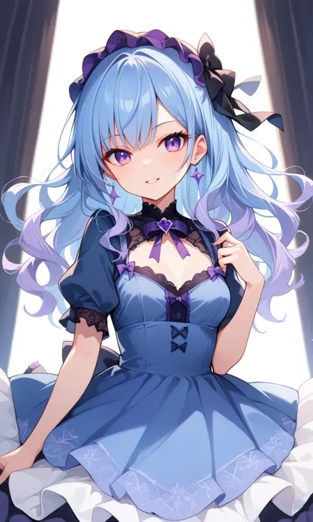 babblty, purple eye, long blue hair, wavy hair, blue to purple gradient, blue dress, masterpiece, best quality, amazing quality, very aesthetic, absundres