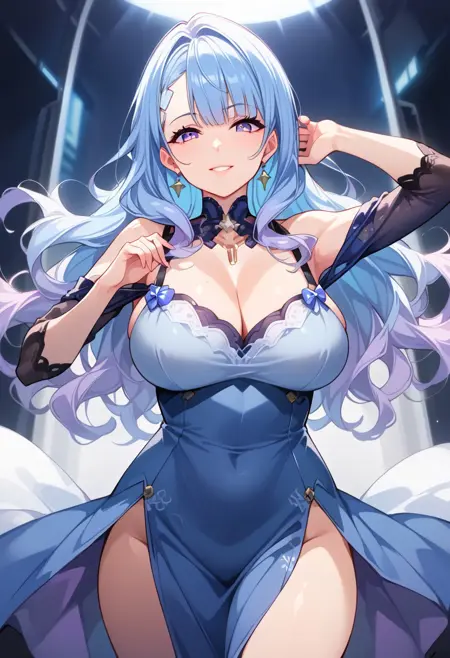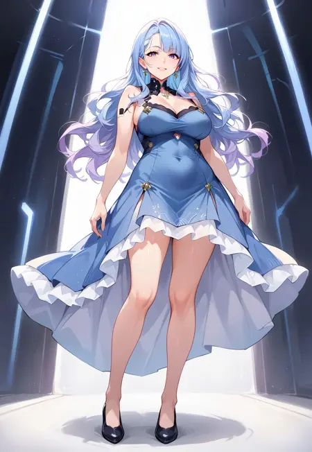 score_9, score_8_up, score_7_up, score_6_up, score_5_up, score_4_up, source_anime, solo, flat color, dark theme, 1girl, babblty, purple eye, long blue hair, wavy hair, blue to purple gradient, blue dress, dynamic pose, looking at viewer,