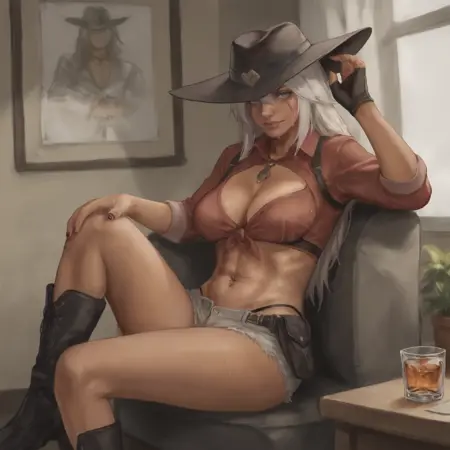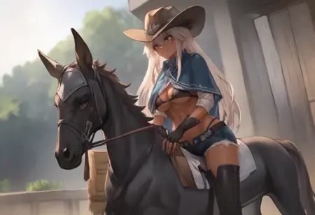 cowboy hat, blue cape, tassels, black bra, cleavage, under boob, belt, hotpants, cutoffs, chaps, crotchless legwear, fingerless gloves, brown boots
