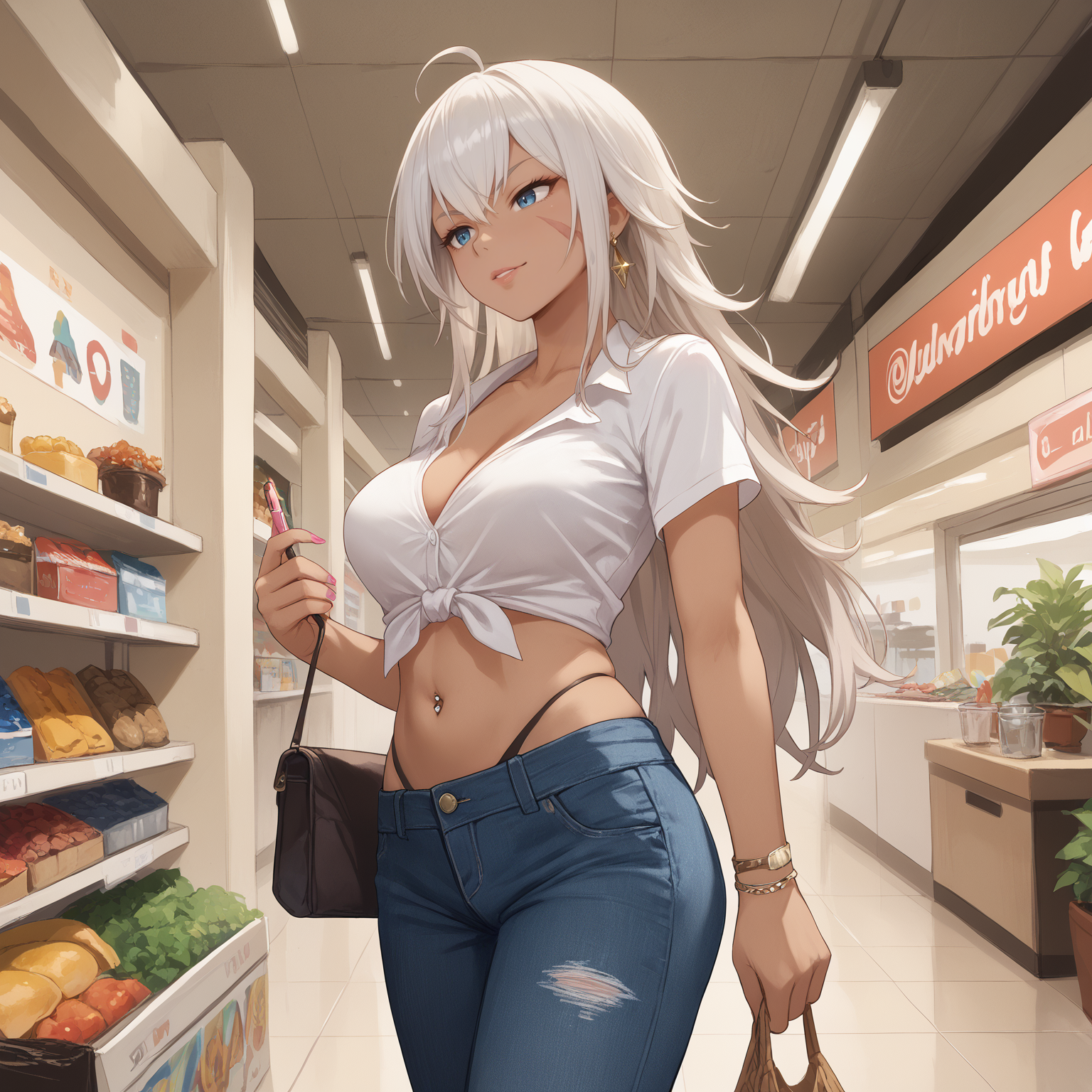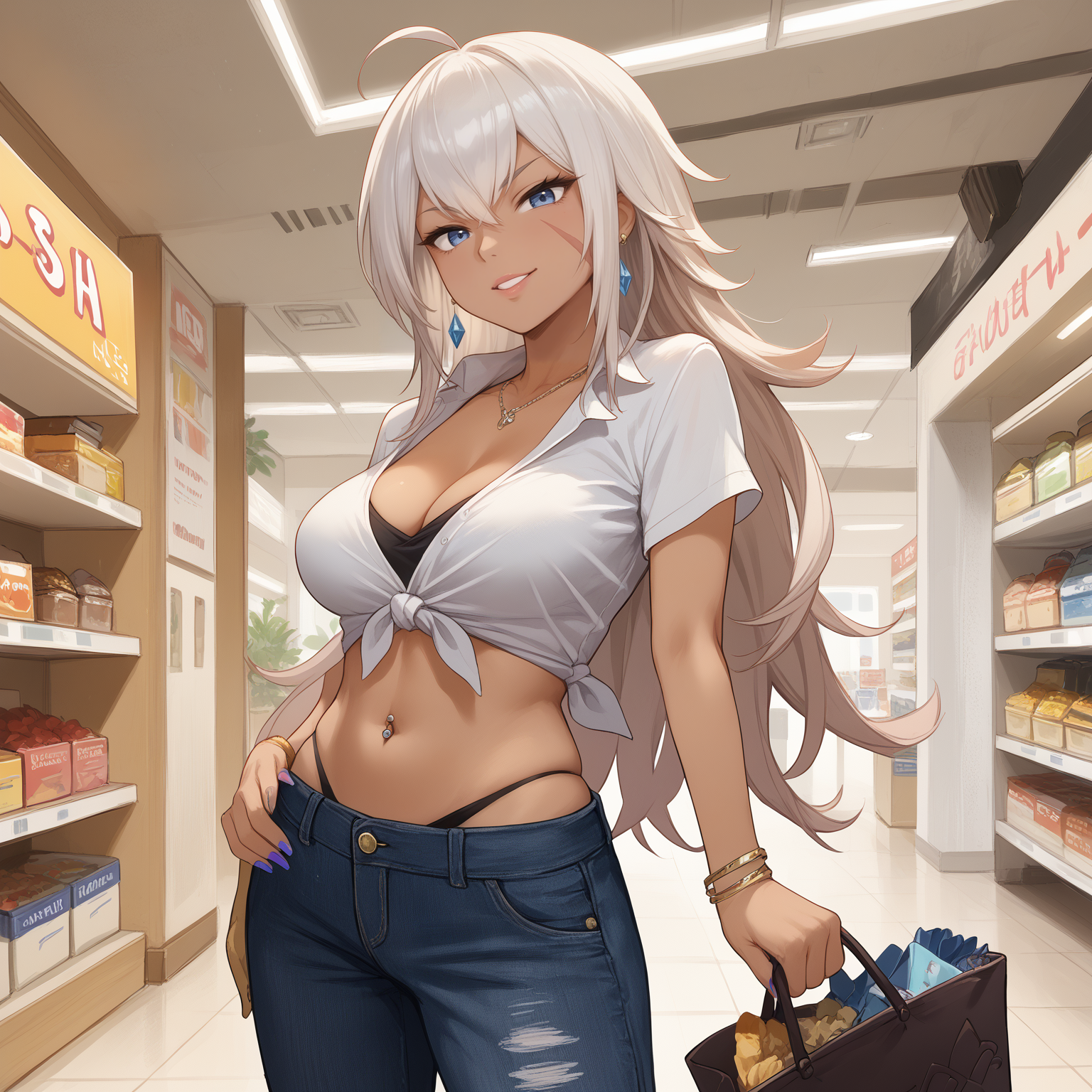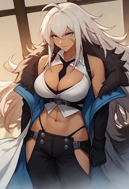 long coat, fur coat, necktie between breasts, harness, cleavage, midriff, black chaps, high-waisted thong, black boots'High Noon Arrest' skin:
