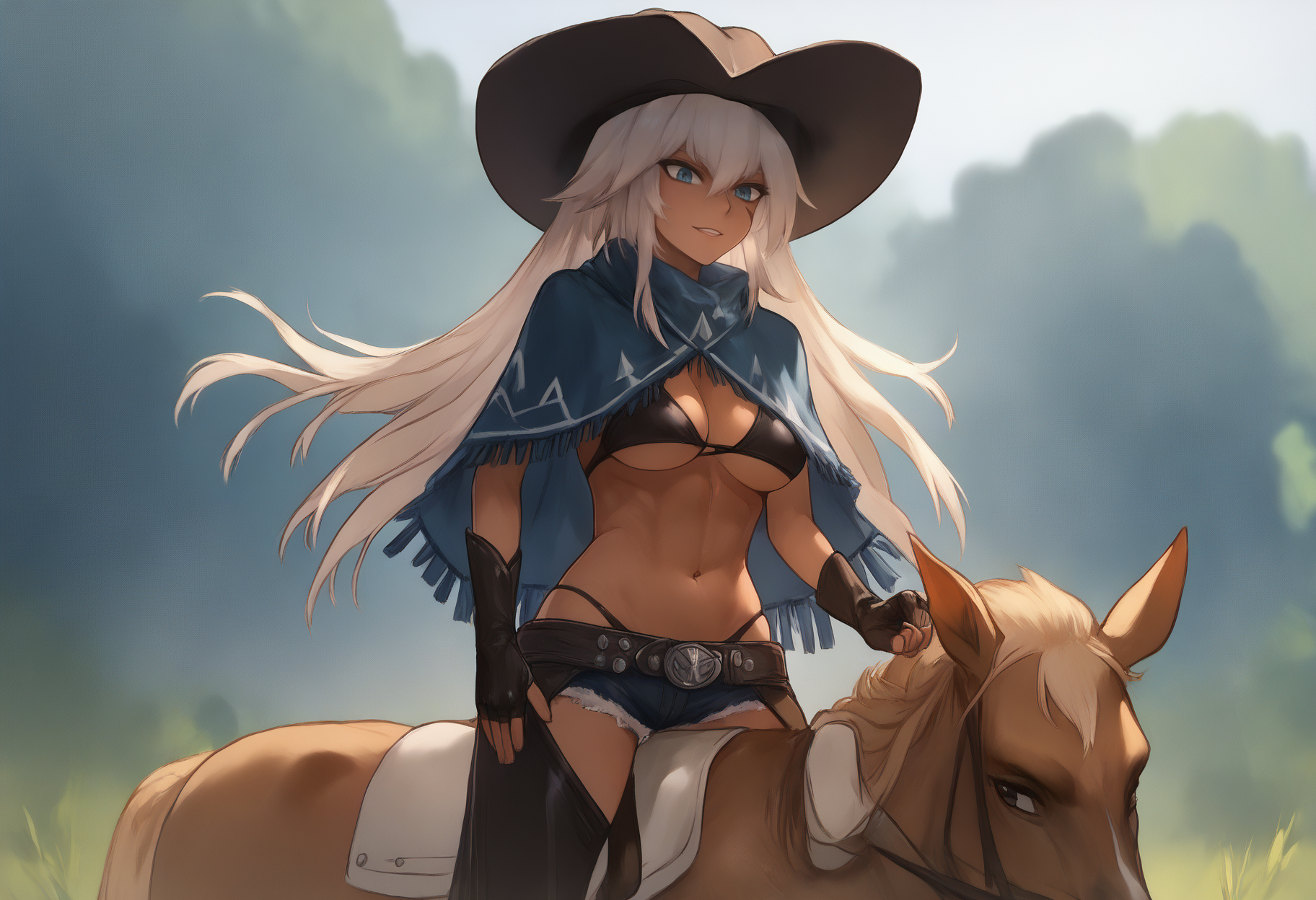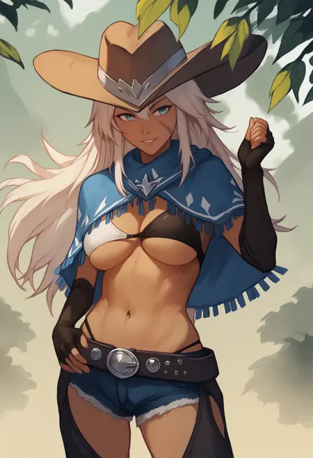 cowboy hat, blue cape, tassels, black bra, cleavage, under boob, belt, hotpants, cutoffs, chaps, crotchless legwear, fingerless gloves, brown boots