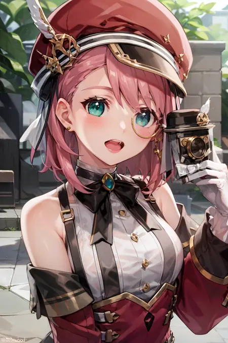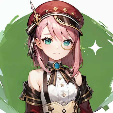 tag:1girl,hat, pink hair, gloves, bare shoulders, belt, green eyes,thigh strap, detached sleeves, white shirt, monocle, short hair, jewelry,ribbon, hat feather,
