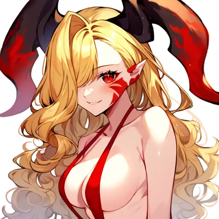 1girl, blonde hair, wavy hair, long hair, hair over one eye, hair intakes, pointy ears, red eyes, horns, dragon horns, facial mark,