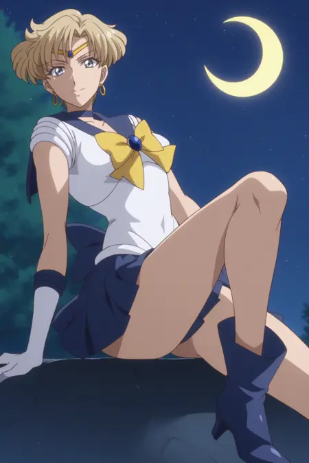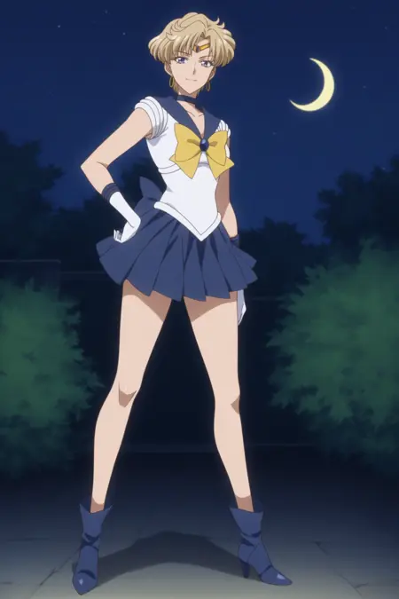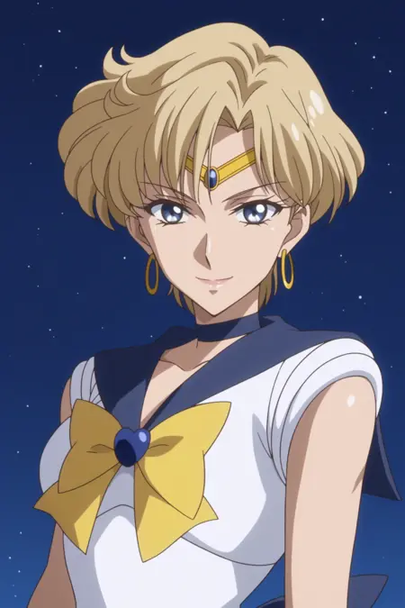 tenoh haruka,极短发,金发,蓝眼睛,黄色耳环,新月形耳环,水手战士制服,白色制服,短袖,魔法少女,蓝色项圈,水手领,蓝色领子,黄色蝴蝶结,头环,白色手套,蓝色裙子,百褶裙,背后蝴蝶结,蓝色背后蝴蝶结,蓝色靴子