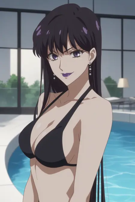 mistress 9, 극도로 긴 머리카락, 검은 머리카락, 앞머리, 보라색 눈, 메이크업, 보라색 입술, 귀걸이, 소매 없음, 칼라 있는 드레스, 파란 드레스, 검은 드레스, 검은 칼라, 보석, 진주(보석), 가슴 부분 드러남