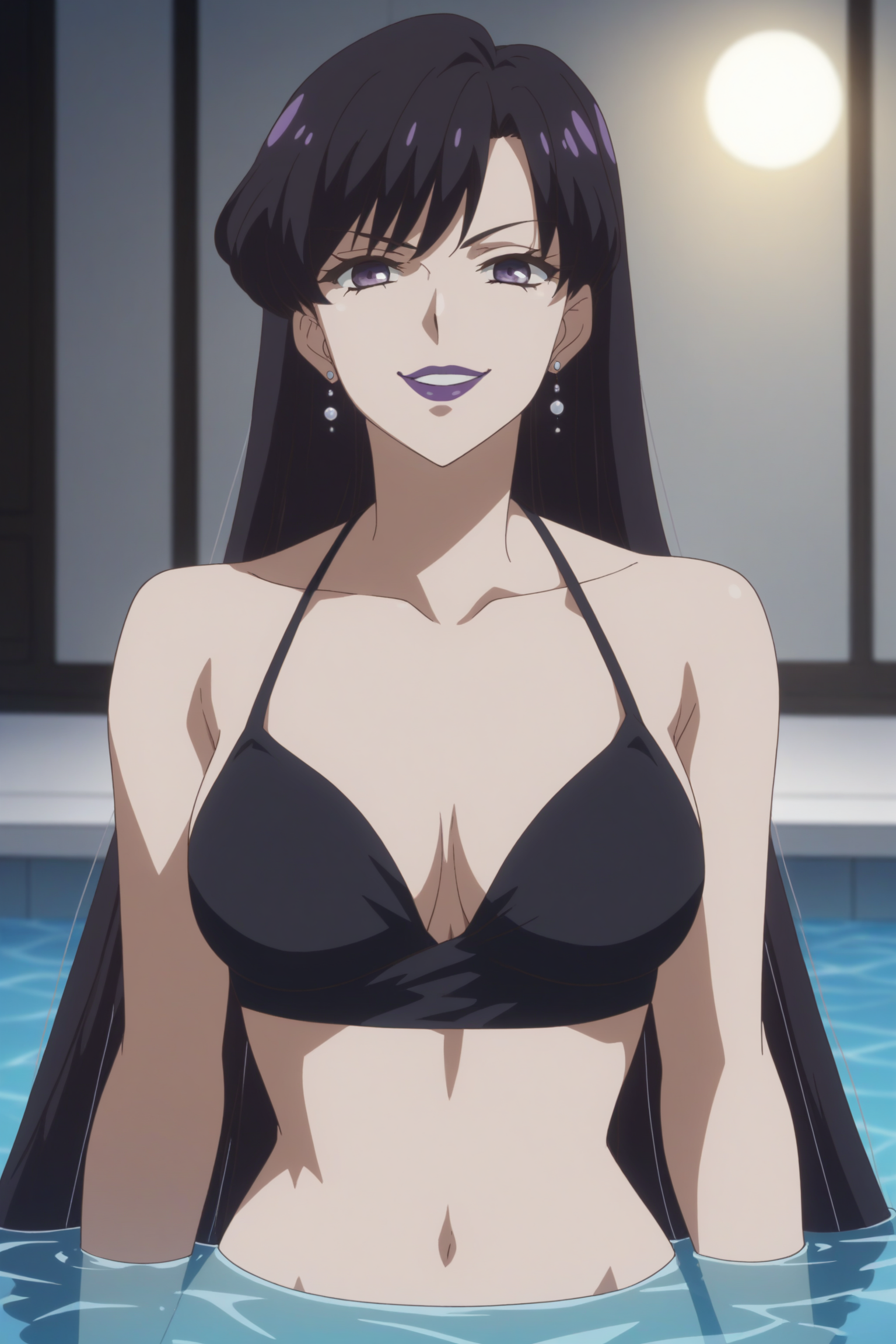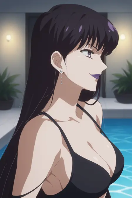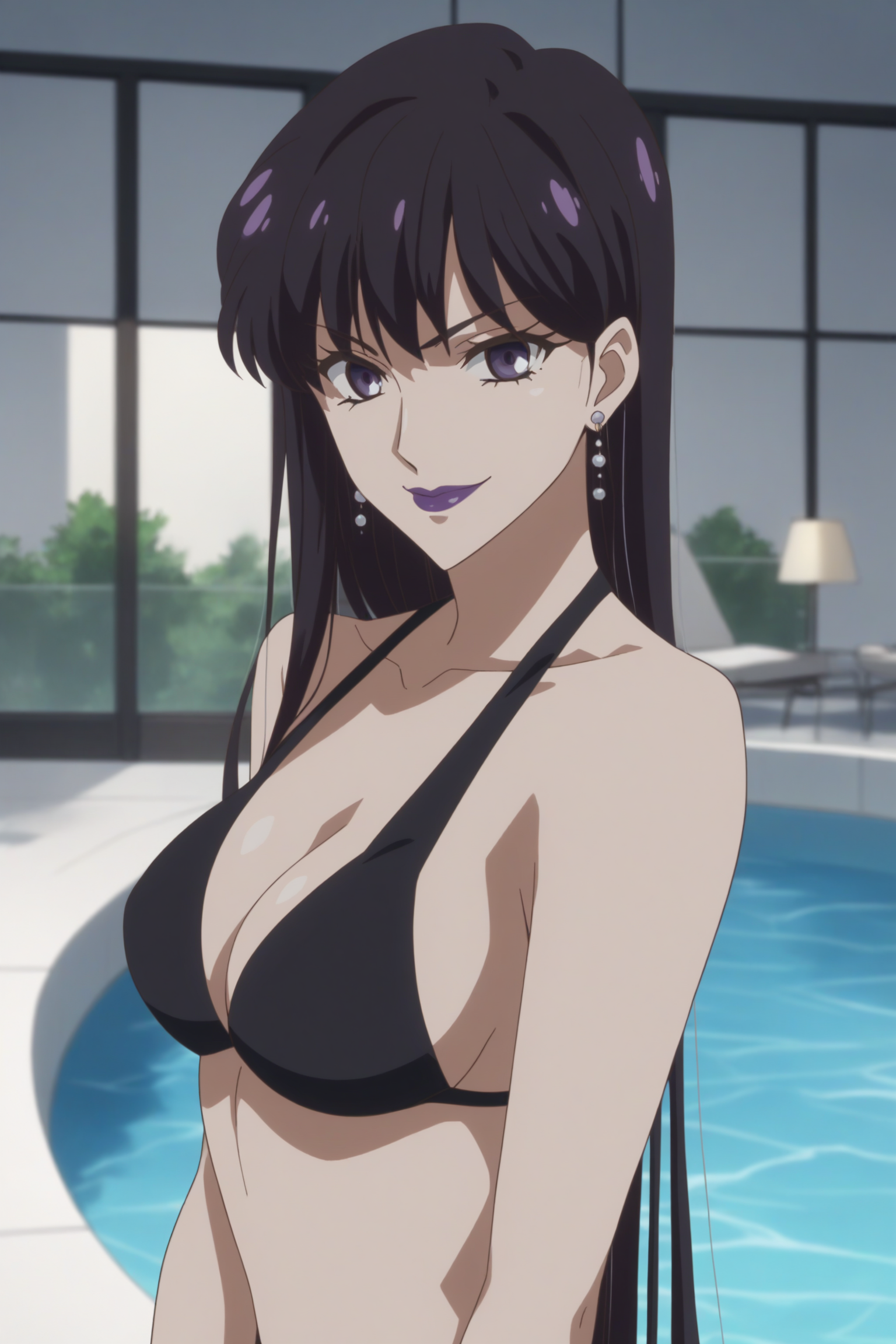 mistress 9, absurdly long hair, black hair, bangs, purple eyes, makeup, purple lips, earrings, sleeveless, collared dress, blue dress, black dress, black collar, jewelry, pearl (gemstone), cleavage