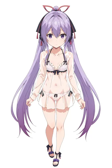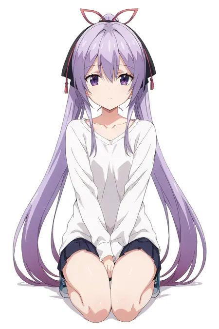 suzuka nagami, purple hair, purple eyes, long hair, very long hair, hair between eyes, bangs, ponytail, twintails, ribbon, hair ribbon, black ribbon