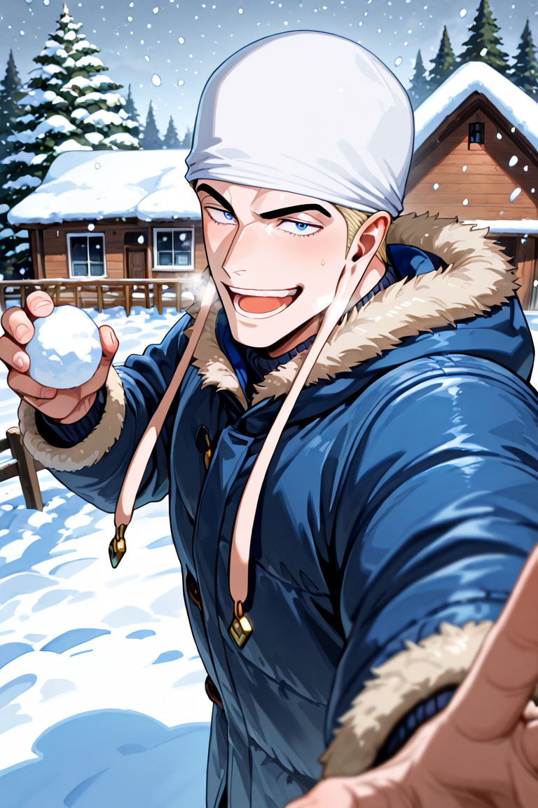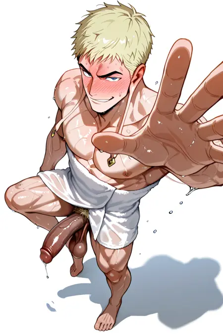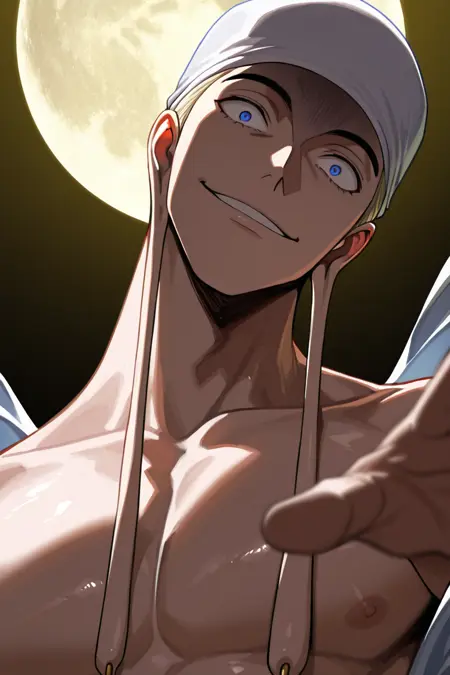 Pos: enel-1male with long earlobes focus, white_enel_headwear, blonde_enel_hair, blue eyes