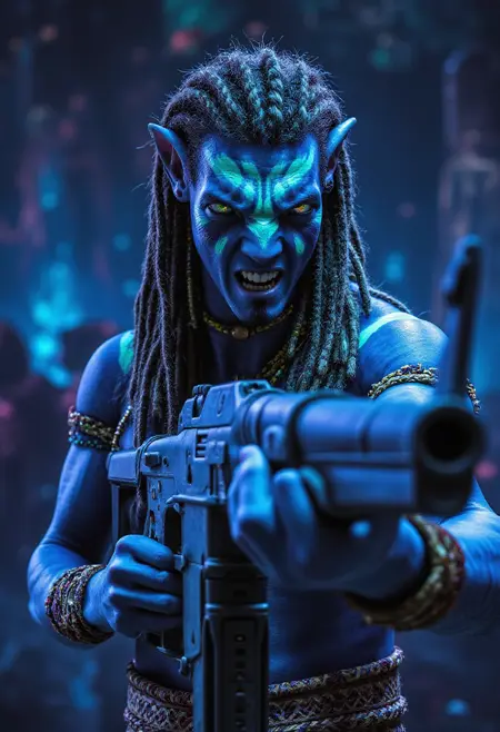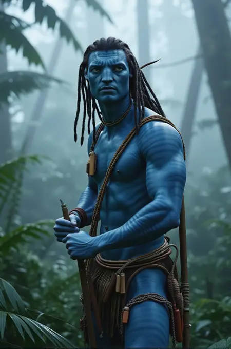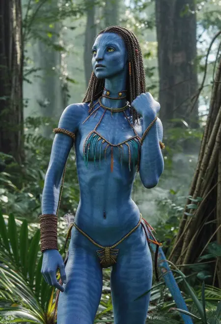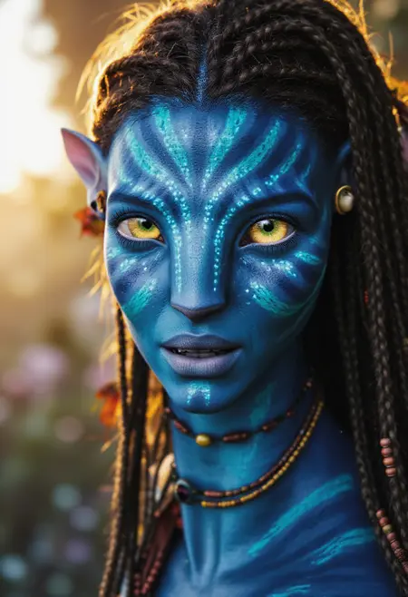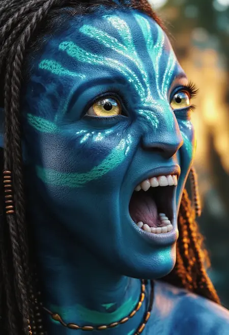 Avatar LoRA,最常用的关键词通常是“蓝色女人/男人”、“脏辫”、“彩绘脸”来描绘纳威人,你也可以使用“班西”或“伊克拉”来生成飞行生物。你还可以组合使用,例如“骑着班西的留着脏辫的蓝色男人”。
