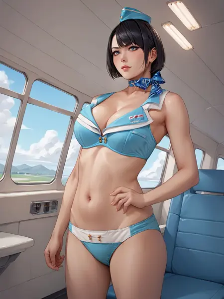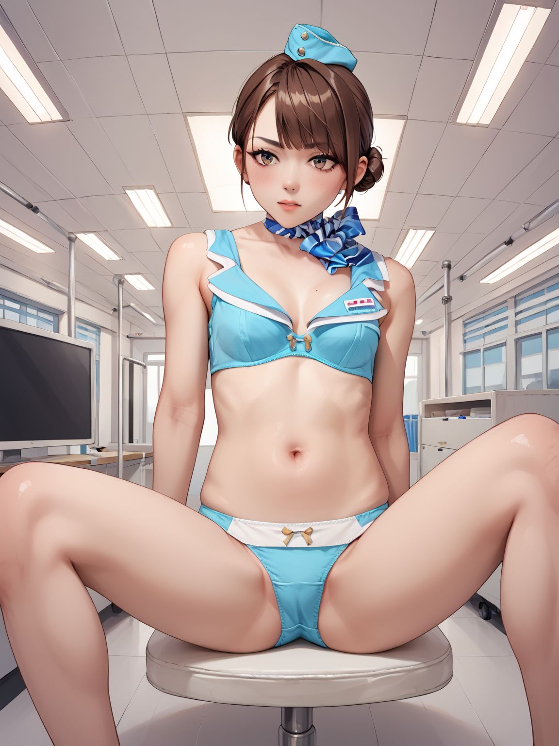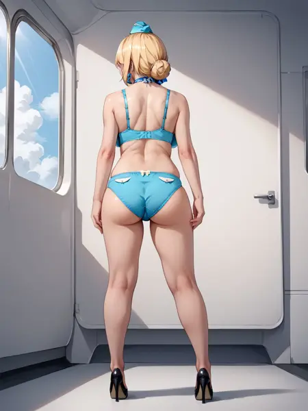 航空乗務員,下着,パンツ,青いパンツ,ブラ,青いブラ,クロップトップ,スカーフ,青いスカーフ,ガーリソンキャップ,青い頭部装具,ミニハット